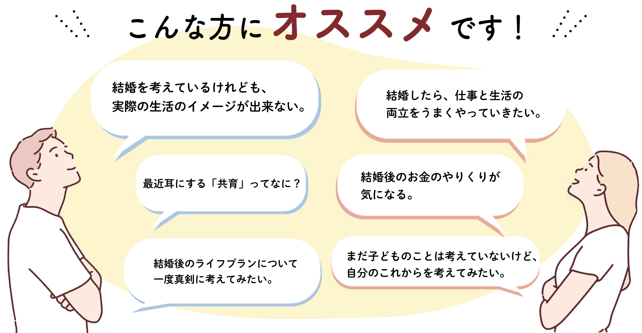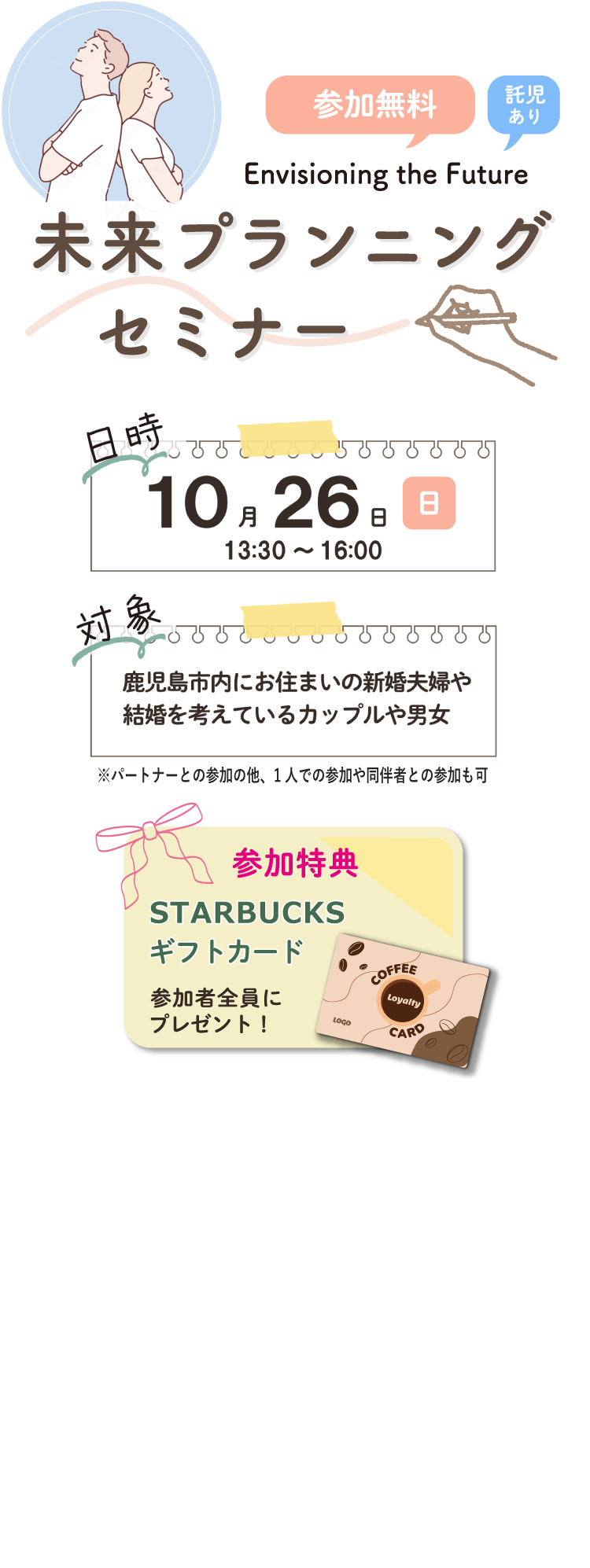 参加対象 | 鹿児島市にお住まいの新婚夫婦または結婚を考えているカップルや男女 ※パートナーとの参加の他、1人での参加や同伴者との参加も可 |